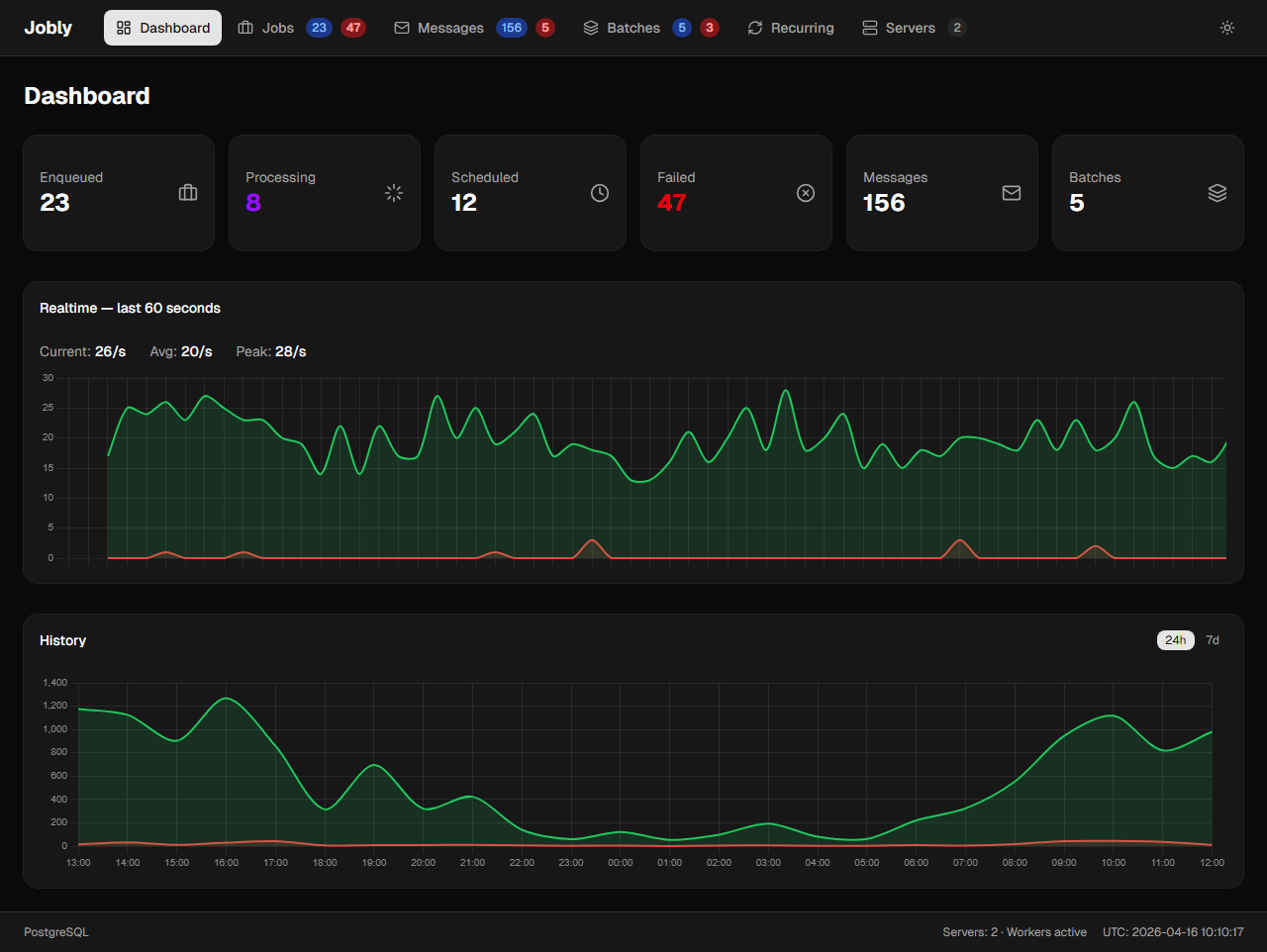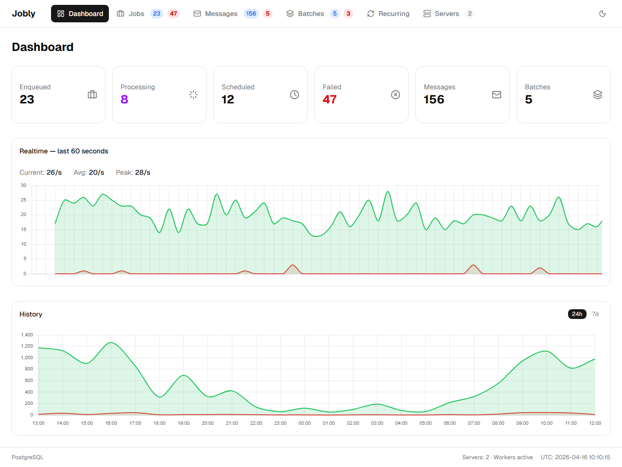 Built-in dashboard with live graphs, job detail with full exception traces, pipeline logging, and job tracing across handlers.