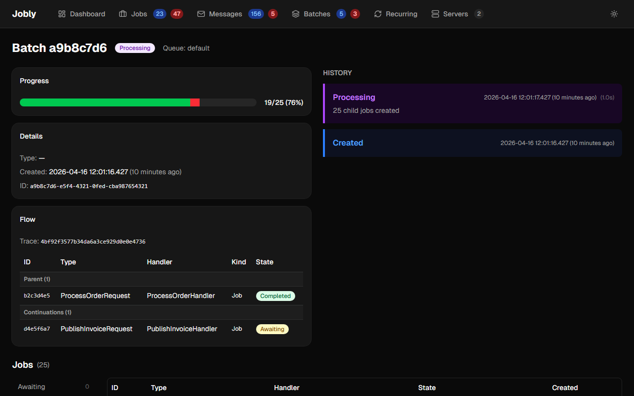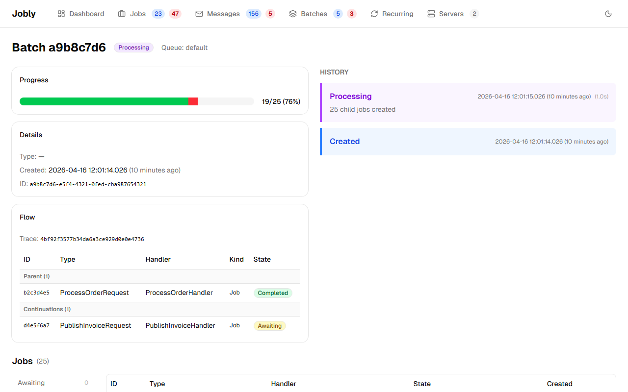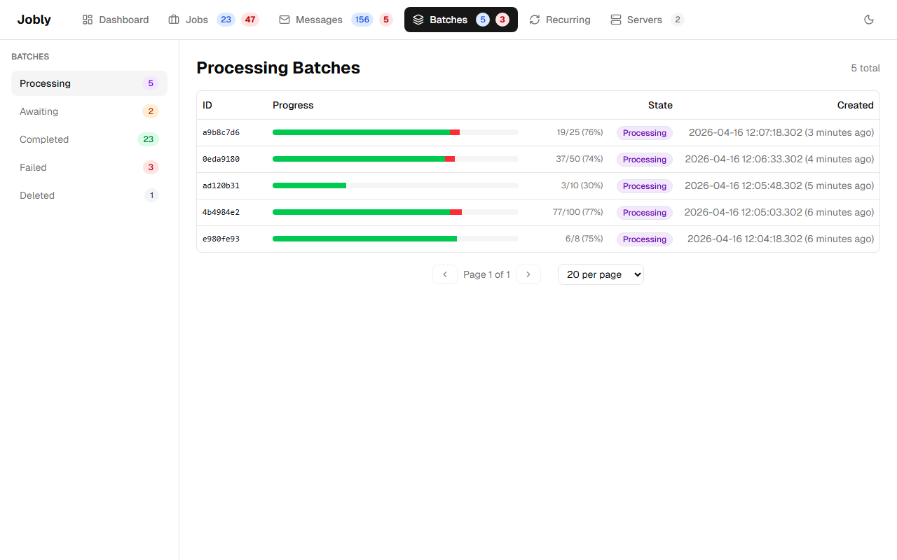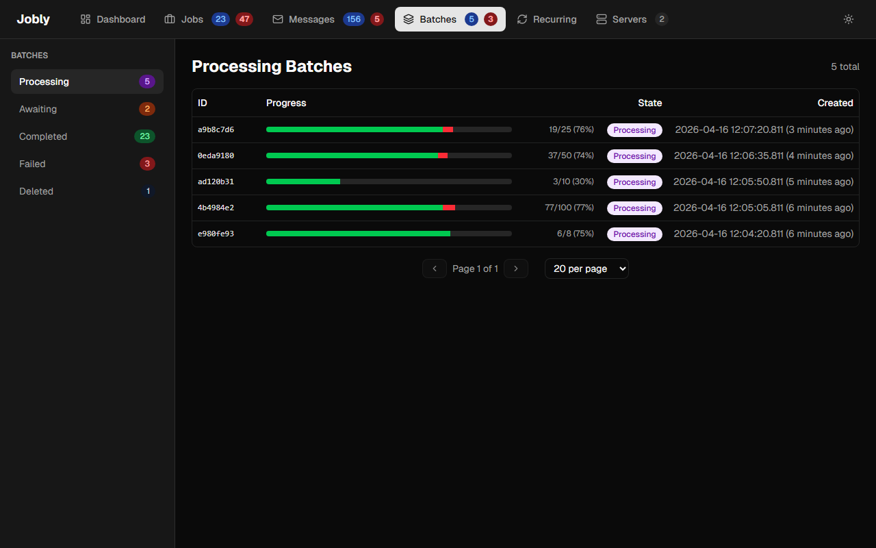 Each batch displays a stacked progress bar with green for completed jobs and red for failed jobs, giving an at-a-glance view of batch health. The progress bar uses navigation properties to compute live counts from the current child job states, so it always reflects the real-time status of the batch.