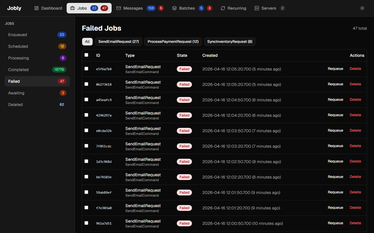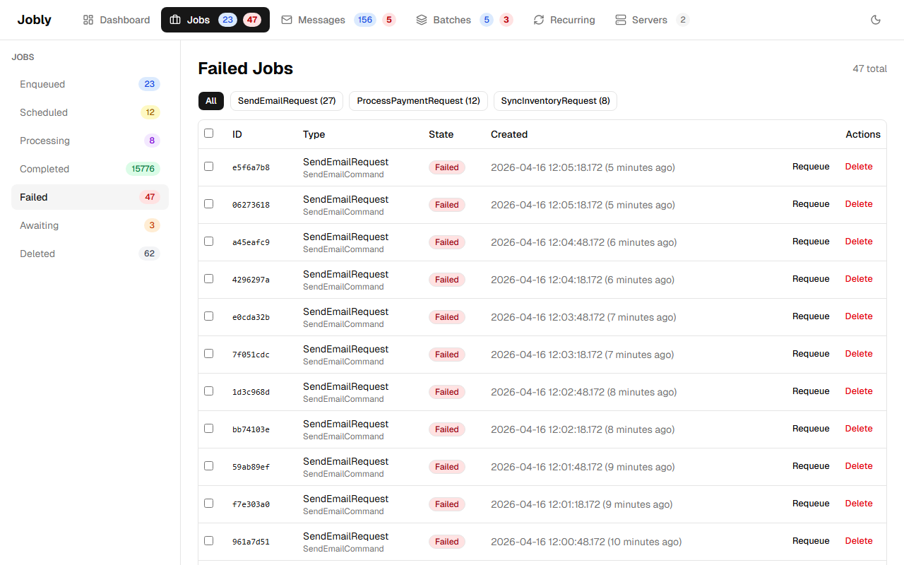 Browse jobs by state using the left sidebar: Enqueued, Scheduled, Processing, Completed, Failed, Awaiting.