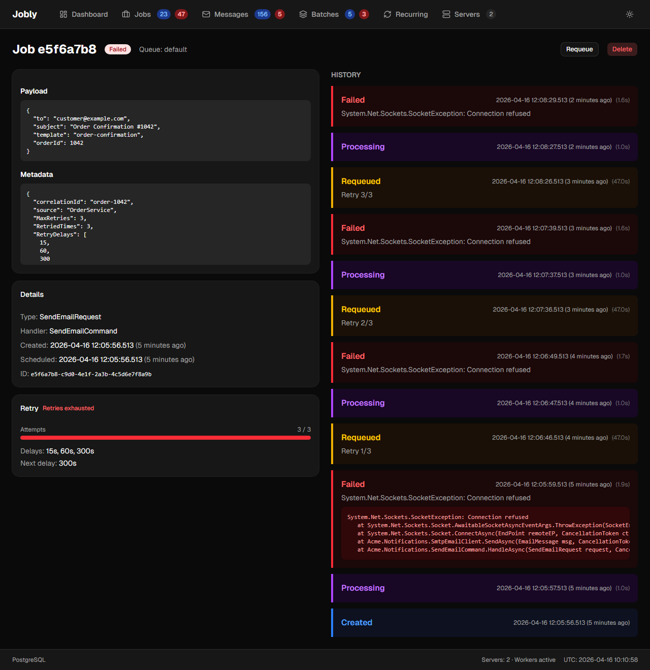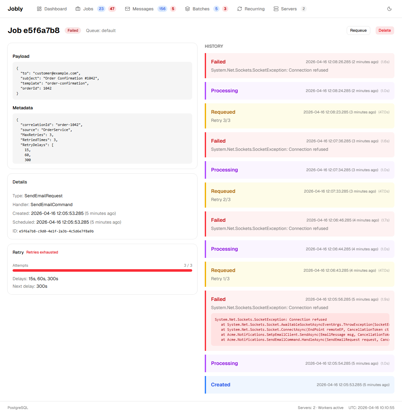 - Details — Type, handler, timestamps, retry count