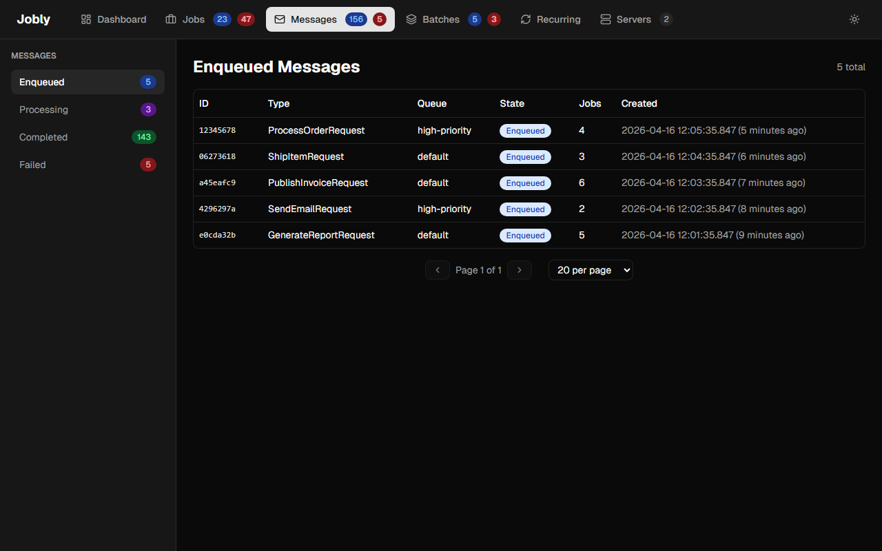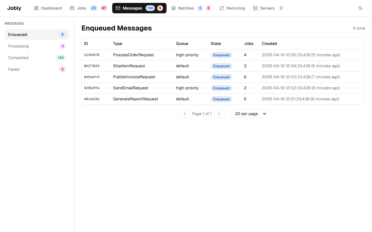 The messages list shows a live job count for each message. This is the totalJobs value computed from the current child job records, not a stale jobCount snapshot. The count updates as handlers are discovered and child jobs are created by the MessageRouter.