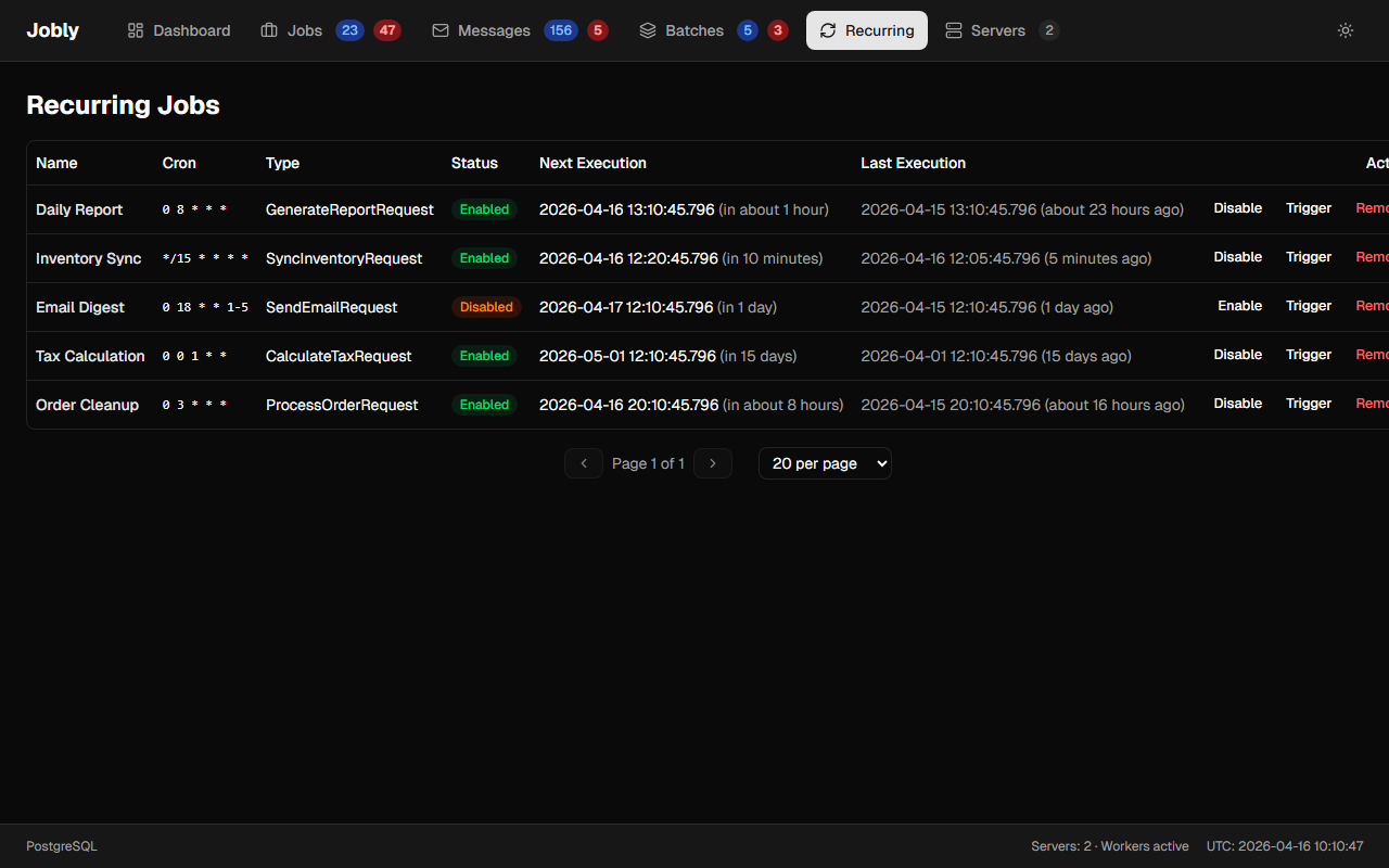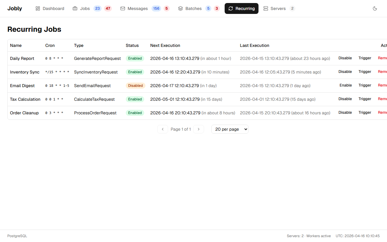 For full documentation on configuring and using recurring jobs, see Recurring Jobs.