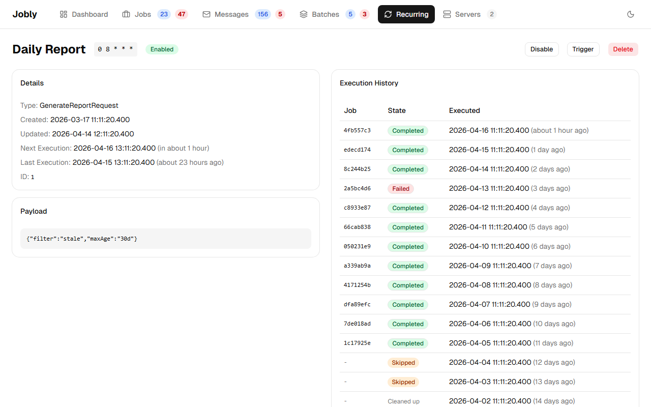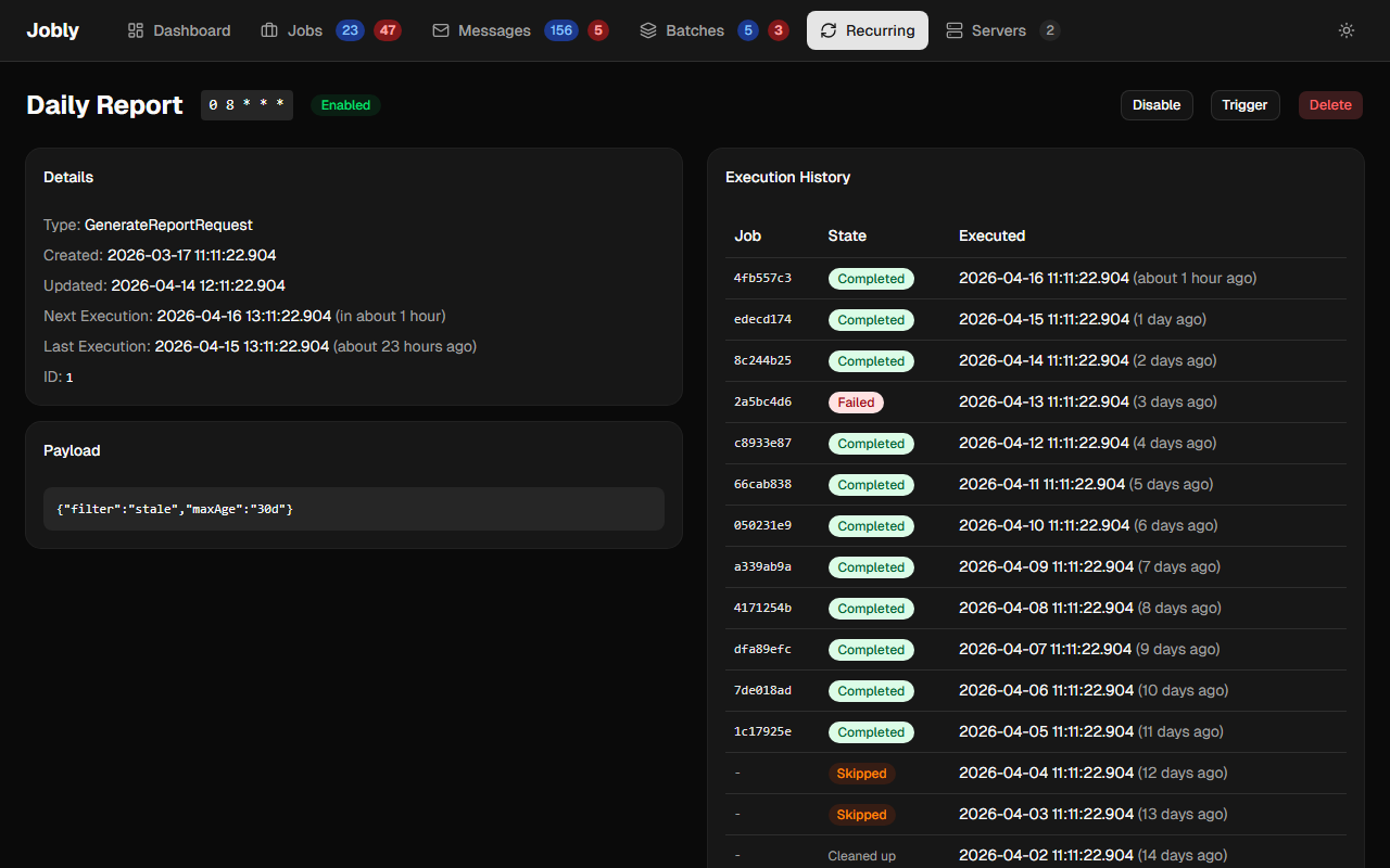 - Enable / Disable — toggle whether the scheduler creates real jobs or skips. Disabled jobs still fire on schedule but record "Skipped" entries in the history instead. The recurring job list shows an Enabled or Disabled badge per row.